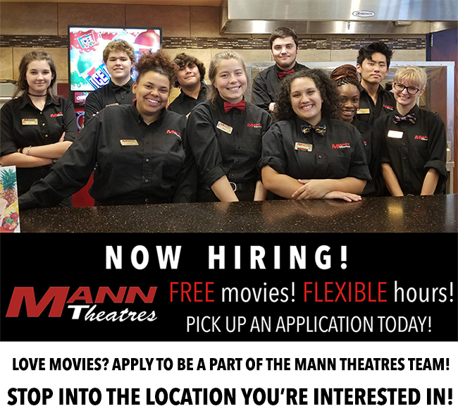 For employment opportunities please stop into the Mann Theatre location you're interested in and fill out an application!
